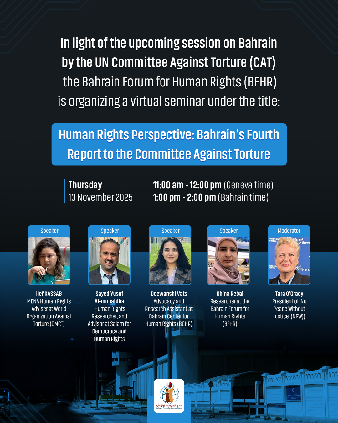 The Bahrain Forum for Human Rights (BFHR) organized a virtual seminar entitled “A Human Rights Perspective: Bahrain’s Fourth Report to the Committee Against Torture” on November 13, 2025, in light of the UN Committee Against Torture (CAT) session on Bahrain, which will be held in Geneva on November 18, 2025. Click here to watch the full seminar The panelists included Ilef KASSAB - MENA Human Rights Adviser at World Organization Against Torture (OMCT), Sayed Yusuf Al-muhafdha - Human Rights Researcher, and Advisor at Salam for Democracy and Human Rights (SalamDHR), Deewanshi Vats - Advocacy and Research Assistant at Bahrain Center for Human Rights (BCHR), Ghina Rebai - Researcher at the Bahrain Forum for Human Rights (BFHR). The panel was moderated by Tara O'Grady - President of ‘No Peace Without Justice’ (NPWJ). Kassab: At least two political prisoners died due to medical negligence In her speech, Ilef Kassab - MENA Human Rights Adviser at World Organization Against Torture (OMCT), said that "The Ombudsman, the Special Investigation Unit, the National Institution for Human Rights, are formally active, yet remain subordinate to either the Ministry of Interior or the Public Prosecution […] We have institutions that absorb criticism but rarely deliver justice." Kassab added that “Conditions in Jau Prison and Dry Dock include prolonged solitary confinement, denial of medical care, and collective punishments. At least two political prisoners died due to medical negligence, which triggered the ‘Stop the Slow Death Policy’ protests. Even minors detained in connection to demonstrations have reported physical assaults and threats of sexual violence during interrogation.” Al-muhafdha: Transitional justice and the psychological rehabilitation of torture victims are essential In his speech, Sayed Yusuf Al-muhafdha - Human Rights Researcher, and Advisor at Salam for Democracy and Human Rights (SalamDHR), stated that “Transitional justice and the psychological rehabilitation of torture victims are essential”, adding that “the current police-state behavior does not reflect compliance with Bahrain’s international obligations, nor does it implement constitutional protections. Instead, it undermines them and deepens mistrust between citizens and the state.” Al-muhafdha also called for the government of Bahrain to meet its international obligations, and for survivors of torture to document and share what they endured, with human rights organizations, emphasizing that “such documentation may not seem urgent now, but it will be vital in the future.” He also shed the light on the dominance of the security apparatus over official and human rights institutions saying that it “has made it impossible for these bodies to fulfill their national and humanitarian roles.” In the end of his speech, Al-muhafdha recommended that “the government [of Bahrain] develop a national human rights project that includes transitional justice within the National Human Rights Plan”. Vats: within Jau Central Prison the situation continues to deteriorate Deewanshi Vats - Advocacy and Research Assistant at Bahrain Center for Human Rights (BCHR), expressed deep concern over the “deteriorating situation that is happening inside Jau Central Prison where recent incidents indicate a serious escalation of torture, abuse, medical neglect, and secterian discrimanation against detainees.” Adding that “the torture in Bahrain is not a remnant of the past, but a practice that persists under conditions of impunity” Vats also added that “within Jau Central Prison the situation continues to deteriorate, according to BCHR documentaion”. Vats mentioned cases of violations in Jau Central Prison including the case of PoC Ahmad Khalil who was transfered to solitary confinement for requesting medical treatment, describing the incident as “a clear violation on Bahrain’s prison law, and the Mandela Rules”, and the recent case of PoC Ali Al-Ardi who was physically assualted and sectarianly insulted by prison guards, which led to “sparking peaceful protests inside the prison… to which the authorities retaliated by canceling family visits, restricting meals, an threatning to use force to end the protest.” Vats concluded that “the [prison] situation is on the verge of breakdown”, and recommended, on behalf of BCHR, that the “Bahraini authorities end the use of solitary confinement and punitive transfers, conduct independent and impartial investigations into the assaults of the prisoners, guarantee unhindered access to medical treatment without reprisal, restore family visits and communications without any restrictions, protect detainees from discrimination, and uphold the freedom of religion and detention facilities.” Rebai: The consequences of torture have to five executions, and four other fatalities among PoCs In the last speech, Ghina Rebai - Researcher at the Bahrain Forum for Human Rights (BFHR), stressed upon what she decribed as “the forms of torture that are more prominently occurring currently according to the Bahrain”, starting by the forms of physical torture applied on citizens during the process of “arbitray arraest”. Rebai then focused on torture procedures that are implemented during interrogation phase against PoCs, mentioning that “based on those torture procedures that detainees get forced to confess to false allegations, that lead to their arbitrary judicial conviction, which could be long years in prison or even the death penalty, as happened to three PoCs in 2017 and two in 2019” adding that “today there are 12 PoCs sentenced to death based on ‘torture-confessions’ and they have exhaused all their legal appeals.” Rebai then addressed “the daily life torture that prisoners endure”, stating that the Bahrain Forum has monitored more than 140 cases of torture in Bairaini prisons that occurred during 2025, shedding the light upon the severe consequen