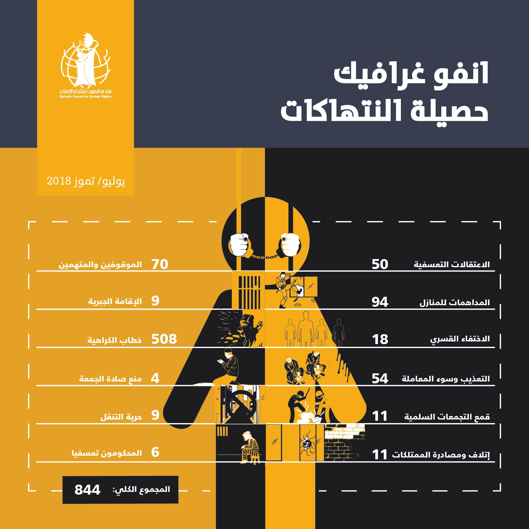 استمر تدهور الأوضاع الحقوقية في البحرين في شهر يوليو/تموز لـ 2018؛ حيث تم رصد 844 انتهاكا جسيما لحقوق الإنسان في الفترة بين 1 – 31/07/2018، توزعت بين الاعتقال التعسفي، والمداهمات للمنازل، والاختفاء القسري، والمحاكمات غير العادلة، وقمع الاحتجاجات السلمية، وتقييد حرية التنقل، ومنع صلاة الجمعة، والمواد الإعلامية المحرضة على خطاب الكراهية، والتعذيب وسوء المعاملة، والإصابات، وإتلاف أو مصادرة الممتلكات، وانتهاك حرية الدين والمعتقد.