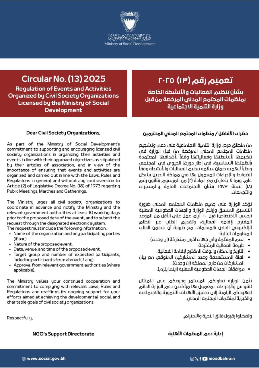 | تعليق لمنتدى البحرين على التعميم رقم (13) لسنة 2025 الصادر عن وزارة التنمية الاجتماعية رغم المفردات التي يراد من خلالها التعبير عن "الإيجابية" في التعاطي مع المنظمات الأهلية فإنَّ التعميم الصادر عن وزارة التنمية الاجتماعية البحرينية برقم (13) لسنة 2025 يفرض عددا من المحددات الإدارية التي تقوض النشاط المدني ويجعله خاضع للتقديرات السياسية الرسمية بما يخلق مزيد من مناخات القلق والخوف خشية المسائلة للعاملين في تلك المنظمات، ويزيد من اضعاف دور المجتمع المدني ويساهم في مزيد من تقييد حرية التعبير عن الرأي. كما أنَّ التأكيد على العمل بالمرسوم رقم (18) لسنة 1973 بشأن الاجتماعات العامة والمسيرات يظهر بوضوح أن السلطة ما زالت تتعامل مع النشاط الأهلي بعقلية "الترخيص الأمني" لا "الحق المدني" المكفول في الاتفاقيات الدولية من دون قيود تحد من أثره. إنَّ فرض التنسيق المسبق مع الجهات الحكومية يحول المنظمات الأهلية إلى وحدات إدارية خاضعة للوصاية الرسمية، فضلا عن أنَّ الأنشطة المدنية يفترض أن تقوم على مبدأ الإخطار وليس الترخيص المسبق وفق الاشتراطات الدولية لحرية التجمع. يجب أن تتوائم صياغة اللوائح المنظمة للعمل الأهلي بما يتوافق مع مبادئ إعلان الأمم المتحدة لحماية المدافعين عن حقوق الإنسان (1998)، الذي يضمن حرية الاجتماع والعمل المدني دون قيود تعسفية في المواد (1)، (5)، (6)، (12/2)، و(13)، وأيضا المادة (22) من العهد الدولي الخاص بالحقوق المدنية والسياسية التي تضمن حرية تكوين الجمعيات من دون تدخل تعسفي. منتدى البحرين لحقوق الإنسان 11 / 11 / 2025