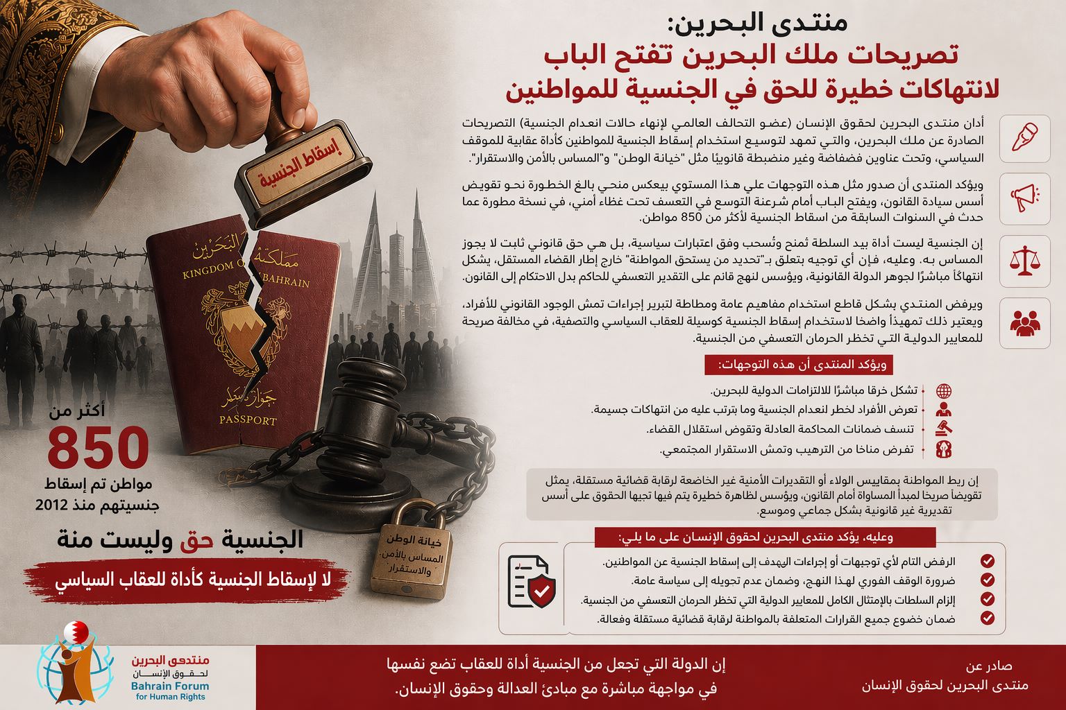 أدان منتدى البحرين لحقوق الإنسان (عضو التحالف العالمي لإنهاء حالات انعدام الجنسية) التصريحات الصادرة عن ملك البحرين، والتي تمهّد لتوسيع استخدام إسقاط الجنسية للمواطنين كأداة عقابية للموقف السياسي، وتحت عناوين فضفاضة وغير منضبطة قانونيًا مثل "خيانة الوطن" و"المساس بالأمن والاستقرار". ويؤكد المنتدى أن صدور مثل هذه التوجهات على هذا المستوى يعكس منحى بالغ الخطورة نحو تقويض أسس سيادة القانون، ويفتح الباب أمام شرعنة التوسع في التعسف تحت غطاء أمني، في نسخة مطورة عما حدث في السنوات السابقة من اسقاط الجنسية لأكثر من 850 مواطن. إن الجنسية ليست أداة بيد السلطة تُمنح وتُسحب وفق اعتبارات سياسية، بل هي حق قانوني ثابت لا يجوز المساس به. وعليه، فإن أي توجيه يتعلق بـ"تحديد من يستحق المواطنة" خارج إطار القضاء المستقل، يشكل انتهاكًا مباشرًا لجوهر الدولة القانونية، ويؤسس لنهج قائم على التقدير التعسفي للحاكم بدل الاحتكام إلى القانون. ويرفض المنتدى بشكل قاطع استخدام مفاهيم عامة ومطاطة لتبرير إجراءات تمسّ الوجود القانوني للأفراد، ويعتبر ذلك تمهيدًا واضحًا لاستخدام إسقاط الجنسية كوسيلة للعقاب السياسي والتصفية، في مخالفة صريحة للمعايير الدولية التي تحظر الحرمان التعسفي من الجنسية. ويؤكد المنتدى أن هذه التوجهات: - تشكل خرقًا مباشرًا للالتزامات الدولية للبحرين. - تعرّض الأفراد لخطر انعدام الجنسية وما يترتب عليه من انتهاكات جسيمة. - تنسف ضمانات المحاكمة العادلة وتقوّض استقلال القضاء. - تفرض مناخًا من الترهيب وتمسّ الاستقرار المجتمعي. إن ربط المواطنة بمقاييس الولاء أو التقديرات الأمنية غير الخاضعة لرقابة قضائية مستقلة، يمثل تقويضًا صريحًا لمبدأ المساواة أمام القانون، ويؤسس لظاهرة خطيرة يتم فيها تجريد الحقوق على أسس تقديرية غير قانونية بشكل جماعي وموسع. وعليه، يؤكد منتدى البحرين لحقوق الإنسان على ما يلي: - الرفض التام لأي توجيهات أو إجراءات تهدف إلى إسقاط الجنسية عن المواطنين. - ضرورة الوقف الفوري لهذا النهج، وضمان عدم تحويله إلى سياسة عامة. - إلزام السلطات بالإمتثال الكامل للمعايير الدولية التي تحظر الحرمان التعسفي من الجنسية. - ضمان خضوع جميع القرارات المتعلقة بالمواطنة لرقابة قضائية مستقلة وفعالة. إن الدولة التي تجعل من الجنسية أداة للعقاب تضع نفسها في مواجهة مباشرة مع مبادئ العدالة وحقوق الإنسان. صادر عن منتدى البحرين لحقوق الإنسان |